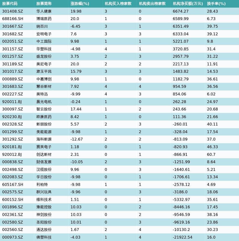 南财智讯4月15日电,盘后数据显示,因当日异动登上龙虎榜的个股中配资资讯平台,31只沪深A股龙虎榜出现了机构的身影,机构合计净卖出33291.74万元,具体来看,机构净买入15只个股,净卖出16只个股。其中,机构净买入前三分别为华人健康(301408.SZ)、博瑞医药(688166.SH)与纳百川(301667.SZ),详情见下图:机构净卖出的个股中,前三分别为佛塑科技(000973.SZ)、通达股份(002560.SZ)与圣阳股份(002580.SZ)。